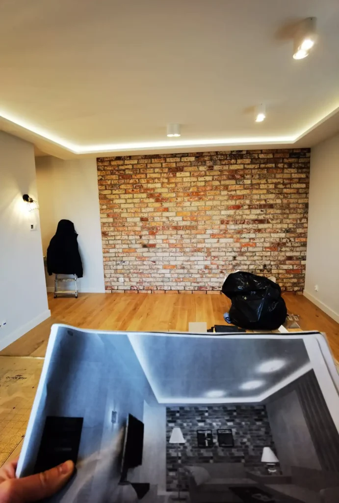 Zastosowano cegłę, glazurę, wykładziny oraz stolarkę drzwiową, które wspólnie tworzą jednolity i czytelny charakter przestrzeni. Oświetlenie zostało zaprojektowane i wykonane w sposób podkreślający strukturę materiałów oraz proporcje wnętrza. Całość uzupełniły pozostałe elementy wykończeniowe, stanowiące kompletną, widoczną warstwę finalną mieszkania.